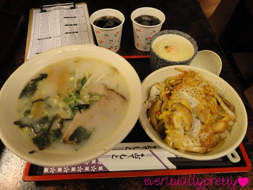 Anyway we were all looking for a good place to eat. One thing I noticed was the Taiwanese have a lot of Japanese restaurants. The reason why will be revealed to me in the next few days. So we ended up eating Japanese food as our first real meal in Taipei. Funny isn't it? We ordered a set meal, which cost us about 200NT. It consisted of Tonkatsu rice toppings, Chawan Mushi (steamed Japanese egg custard) and a beef noodle soup with bean sprouts. Pia and I shared the meal since it was big enough for two. We added additional 20NT for the bottomless soda.